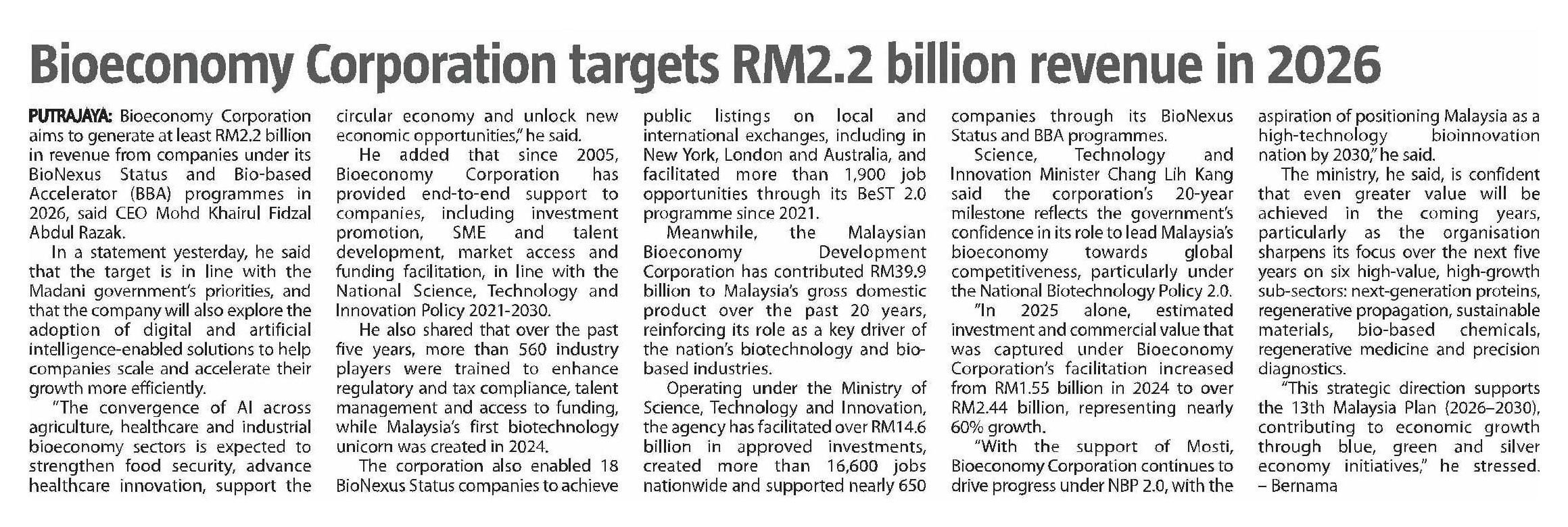 The Sun – Bioeconomy Corporation Targets RM2.2 Billion Revenue in 2026