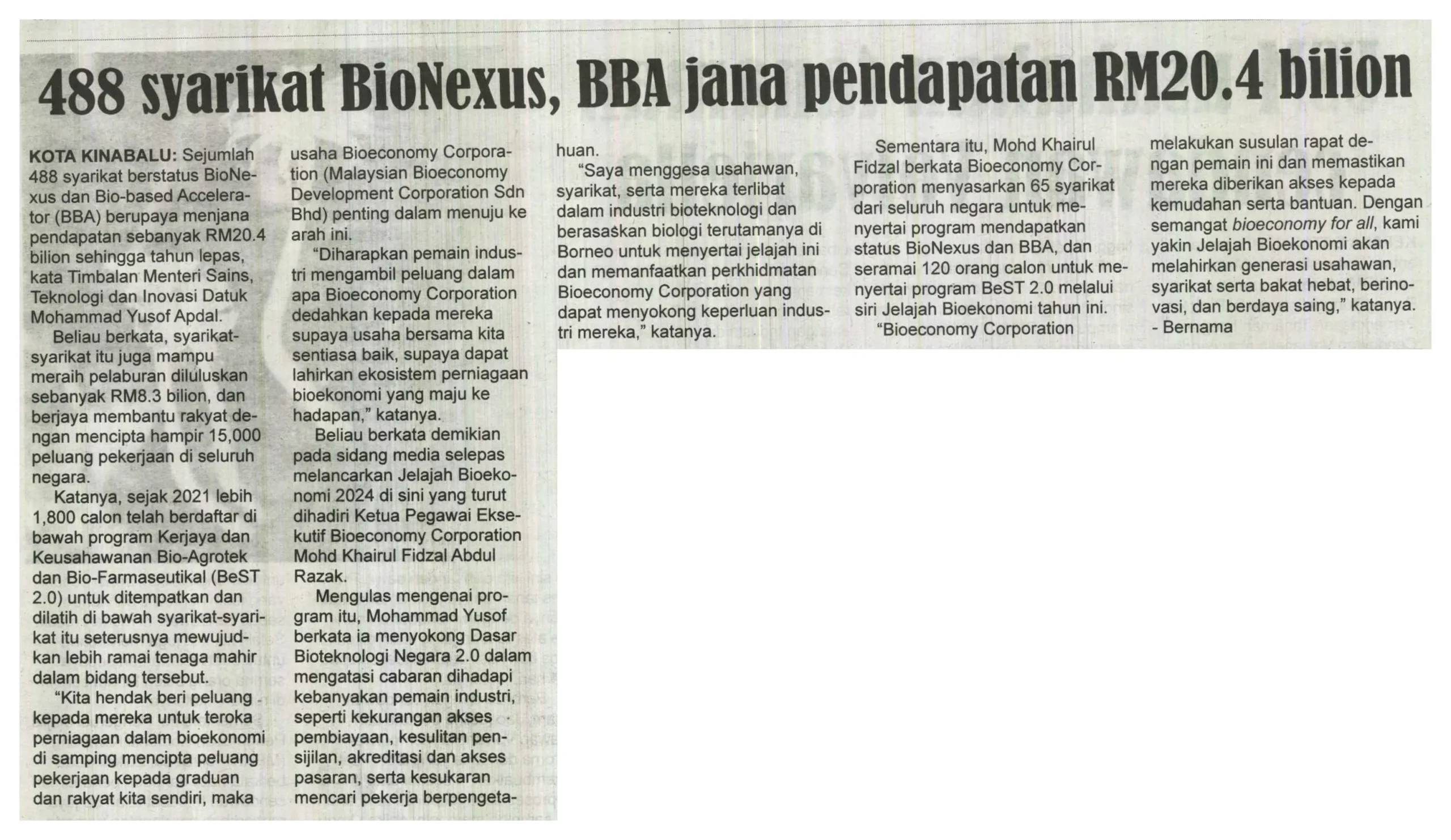 Utusan Sarawak – 488 Syarikat BioNexus, BBA Jana Pendapatan RM20.4 Bilion